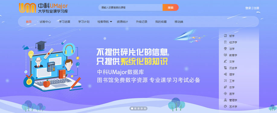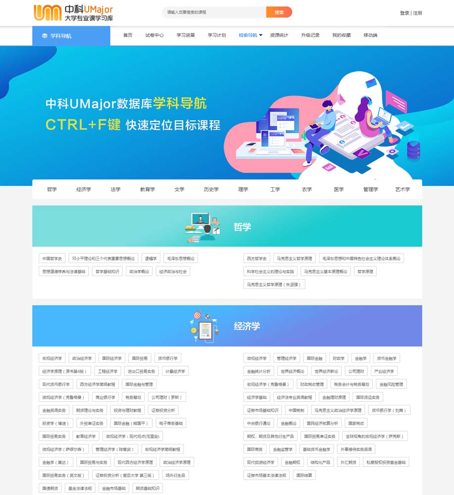 本数据库的学科导航检索功能页面直观展示出本数据库现已收录的所有一级科目(学科门类)、二级科目(专业科目)、三级科目(科目子类),通过CTRL+F键并输入科目关键字即可快速定位到您所感兴趣的专业课学习科目。