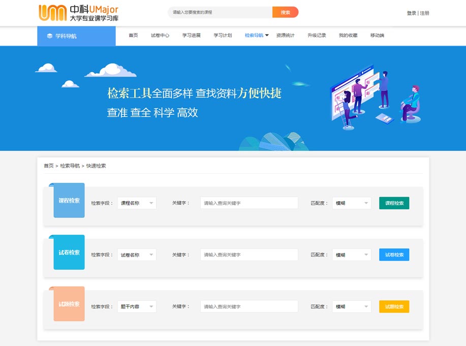 本数据库的快速检索功能细分为“课程检索”、“试卷检索”、“试题检索”、“学科检索”四项,其检索结果依次是视频课程、试卷、试题以及该门学科下相关学习资源。