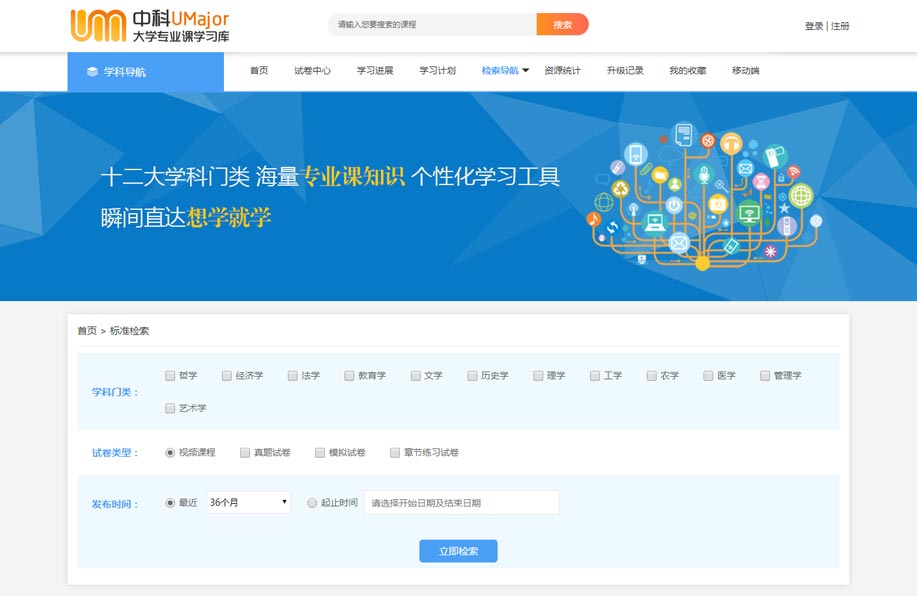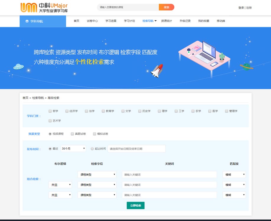 本数据库的标准检索功能支持跨专辑检索、支持对不同类型的学习资源(视频课程/真题试卷/模拟试卷/章节练习试卷)进行检索、支持对特定时间发布的资源进行检索。